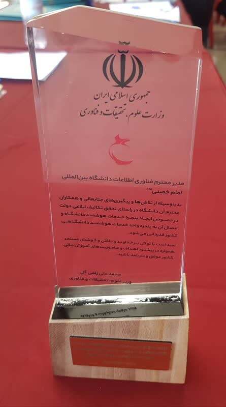 دکتر فرهاد احیایی، مدير فناوری اطلاعات دانشگاه بین المللی امام خمینی (ره) نیز در این مراسم موفق به دریافت تندیس از وزیر علوم تحقیقات و فناوری شد. گفتنی است دانشگاه بین المللی امام خمینی (ره) جزو اولین دانشگاه هایی است که به پنجره خدمات هوشمند دولت متصل شده است.