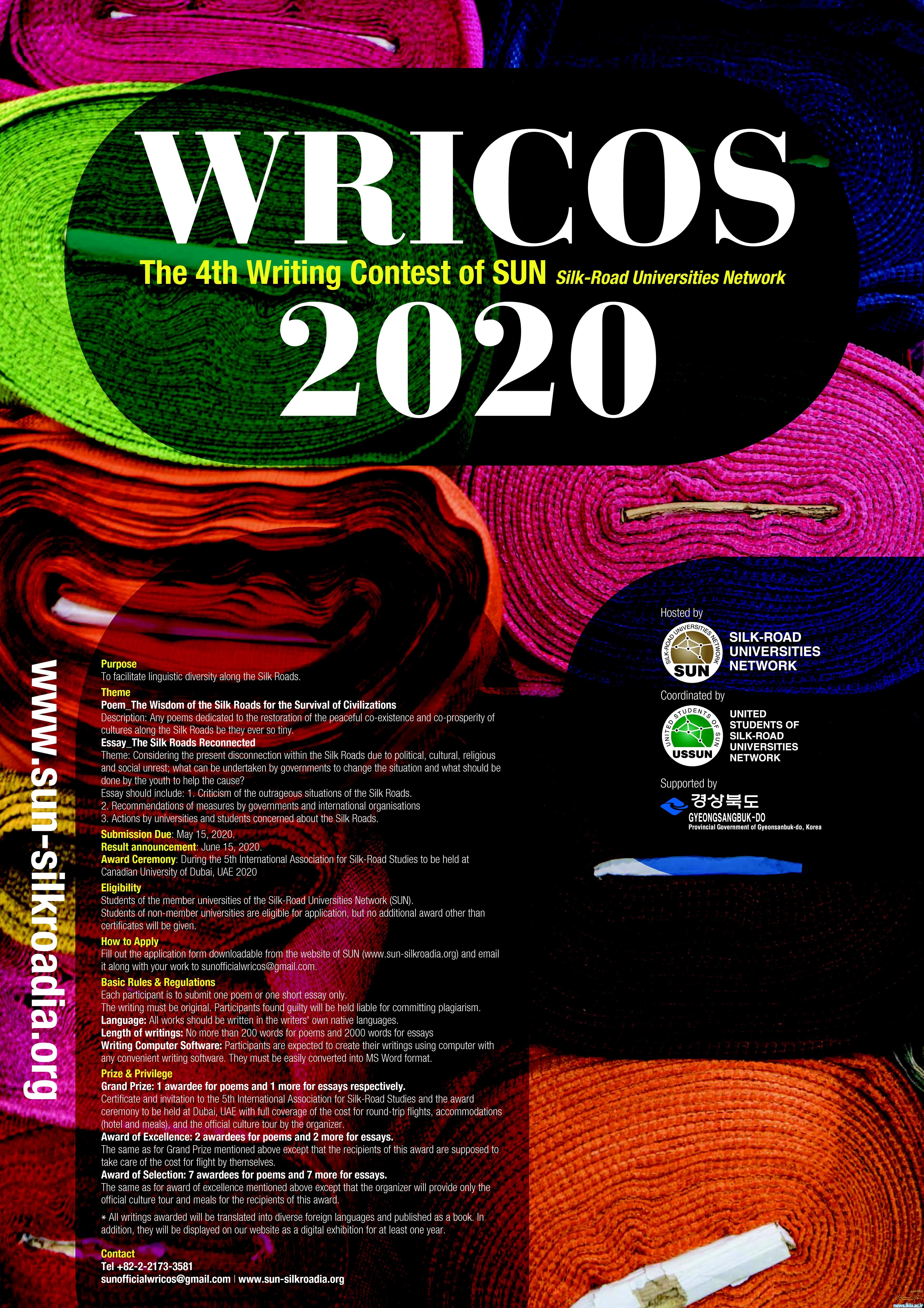 چهارمین دوره مسابقات "شعر و مقاله" شبکه دانشگاههای جاده ابریشم با هدف آشنایی بیشتر با زیبایی های  تفاوتهای زبانی در مسیر جاده ابریشم با موضوع : شعر / حکمت در مسیر جاده ابریشم به منظور پایایی تمدن مقالات و اشعار باید به زبان فارسی باشد. اشعار حداکثر در دویست کلمه  و مقالات حداکثر در دوهزار کلمه به منظور کسب اطلاعات بیشتر به پوستر مسابقه مراجعه فرمایید.