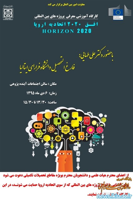 معاونت امور بین الملل دانشگاه به منظور آشنایی علاقه مندان و اعضای هیات علمی و دانشجویان مقاطع تحصیلات تکمیلی با انواع پروژه های بین المللی بویژه پروژه های علمی و تحقیقاتی اتحادیه اروپا در چارچوب برنامه Horizon 2020 کارگاه آموزشی آشنایی با عنوان معرفی انواع پروژه های تحقیقاتی اتحادیه اروپا را با حضور دکتر علی طهایی فارغ التحصیل دانشگاه فرارای ایتالیا برگزار می نماید.
