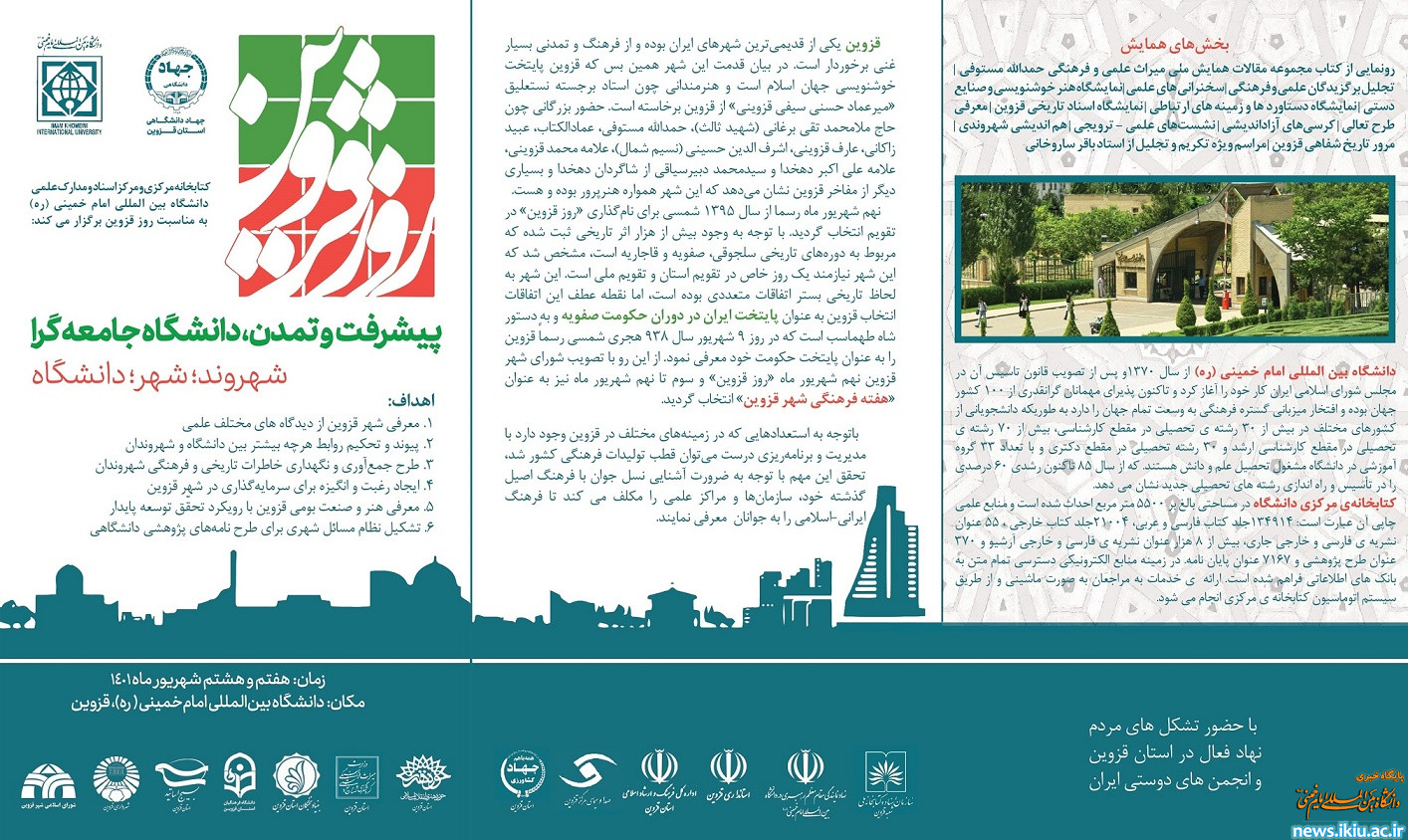 به مناسبت روز قزوین " برنامه های نشست فرهنگی در قالب تجلیل از استاد ساروخانی و چهره های علمی – فرهنگی به همراه رونمایی از کتاب مجموعه مقالات همایش ملی میراث علمی و فرهنگی حمدالله مستوفی، برپایی نمایشگاه هنر خوشنویسی و صنایع دستی، نمایشگاه اسناد تاریخی قزوین و  نشست های علمی- ترویجی و کرسی های آزاد اندیشی در دانشگاه بین المللی امام خمینی ره برگزار می شود. زمان:  روز دوشنبه  7 شهریورماه 1401ساعت:18:30  مکان: میدان ملل. برگزاری نشست های علمی- ترویجی و کرسی های آزاد اندیشی گروه تاریخ: روز دوشنبه 7 شهریورماه ساعت: 9-13. ساختمان آینده پژوهی گروه معماری و شهرسازی: روز دوشنبه 7 شهریور ماه ساعت: 9-13. تالار بوستان گروه ادبیات فارسی: روز سه شنبه 8 شهریورماه ساعت:16-20. تالار بوستان کرسی آزاد اندیشی با عنوان: ضرب المثل های مردم قزوین، نشست علمی- ترویجی با عنوان" شگردهای نثر ژورنالیستی علی اکبر دهخدا، نشست علمی- ترویجی با عنوان" تاملی در اندیشه و آثار علامه محمد قزوینی. محفل ادبی مشاهیر