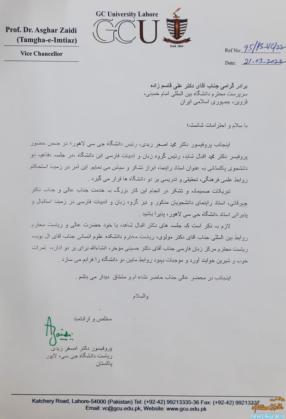 دکتر اصغر زیدی، رئیس دانشگاه جی سی لاهور پاکستان طی نامه ای به دکتر سید علی قاسم زاده سرپرست دانشگاه بین المللی امام خمینی(ره)، ضمن تشکر از همکاری ها و حمایت های صورت گرفته در برگزاری جلسه دفاع رساله مشترک دو دانشگاه، بر تقویت و استحکام روابط علمی، فرهنگی و پژوهشی دو دانشگاه تاکید کرد. گفتنی است؛ اولین جلسه دفاع مشترک رساله دکترای دو نفر از دانشجویان پاکستانی در رشته زبان و ادبیات فارسی با حضور دکتر اقبال شاهد از اساتید دانشگاه جی سی لاهور پاکستان، بهمن ماه سال گذشته در دانشگاه برگزار شد.