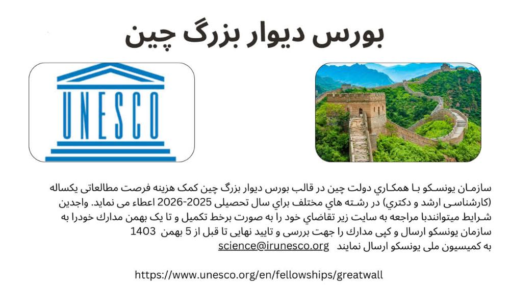 بورس دیوار بزرگ چین سازمـان یونسـکو بـا همکـاري دولت چین در قالب بورس دیوار بزرگ چین کمک هزینه فرصت مطالعاتی یک ساله (کارشناسـی ارشد و دکتري) در رشـته هاي مختلف براي سال تحصیلی 2026-2025 اعطاء می نماید.