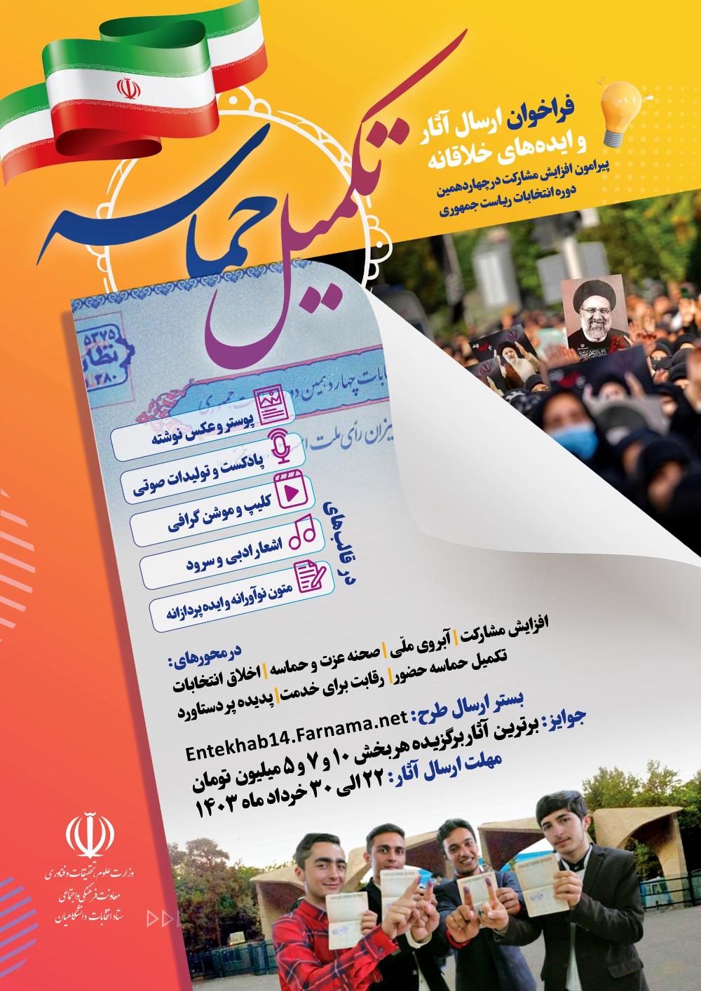 در راستای حمایت از طرح‌ها و ایده‌های خالقانه و نوآورانه دانشجویان، اساتید و یاوران علمی دانشگاه‌های سراسر کشور پیرامون افزایش مشارکت در «چهاردهمین دوره انتخابات ریاست جمهوری»، از مخاطبین دعوت می‌کنیم تا ایده‌ها و آثار ابتکاری خود را در قالب‌های گوناگون از طریق سامانه زیر ارسال نمایند.
